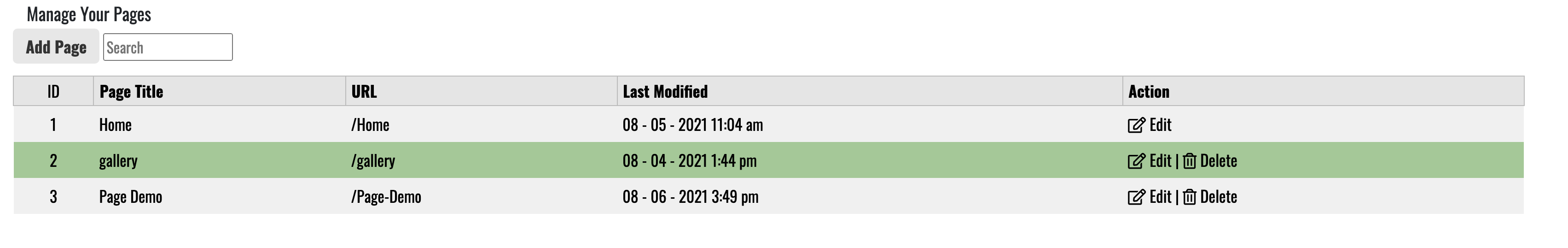 Your pages are layed out in a table, displaying its pageID, Page Title, URL, Last-Modified date & time, and applicable actions. At the top above the table, there is an Add-Page button and a search filter.